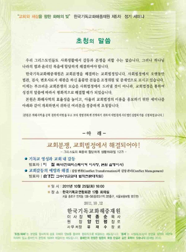 ▢ 일시 : 2011년 10월 25일(화) 16:00▢ 장소 : 한국기독교연합회관 17층 회의실 교회분쟁, 교회법정에서 해결되어야!-그리스도의 복음에 합당하게 생활하라(빌 1:27)- ● 기독교 영성과 교회 내 갈등발표자 : 이 철 목사(한국피스메이커 이사장, 본원 실행이사)● 교회갈등의 예방과 해결발표자 : 손경한 교수/변호사(성균관대 법학전문대학원) 많은 참석바랍니다.