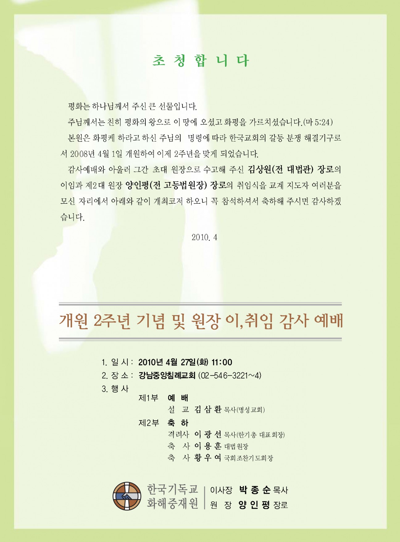 개원 2주년 기념 및 원장 이취임 감사예배 본문 개원 2주년 기념 및 원장 이취임 감사예배 개원 2주년 기념 및 원장 이취임 감사예배 관리자 조회 2,307회 2010-04-13 00:00 수정 삭제 목록 댓글목록 이전글 본원과 한국피스메이커의 교류 협력 협약식 10.07.01 다음글 제3차 정기이사회 10.04.06