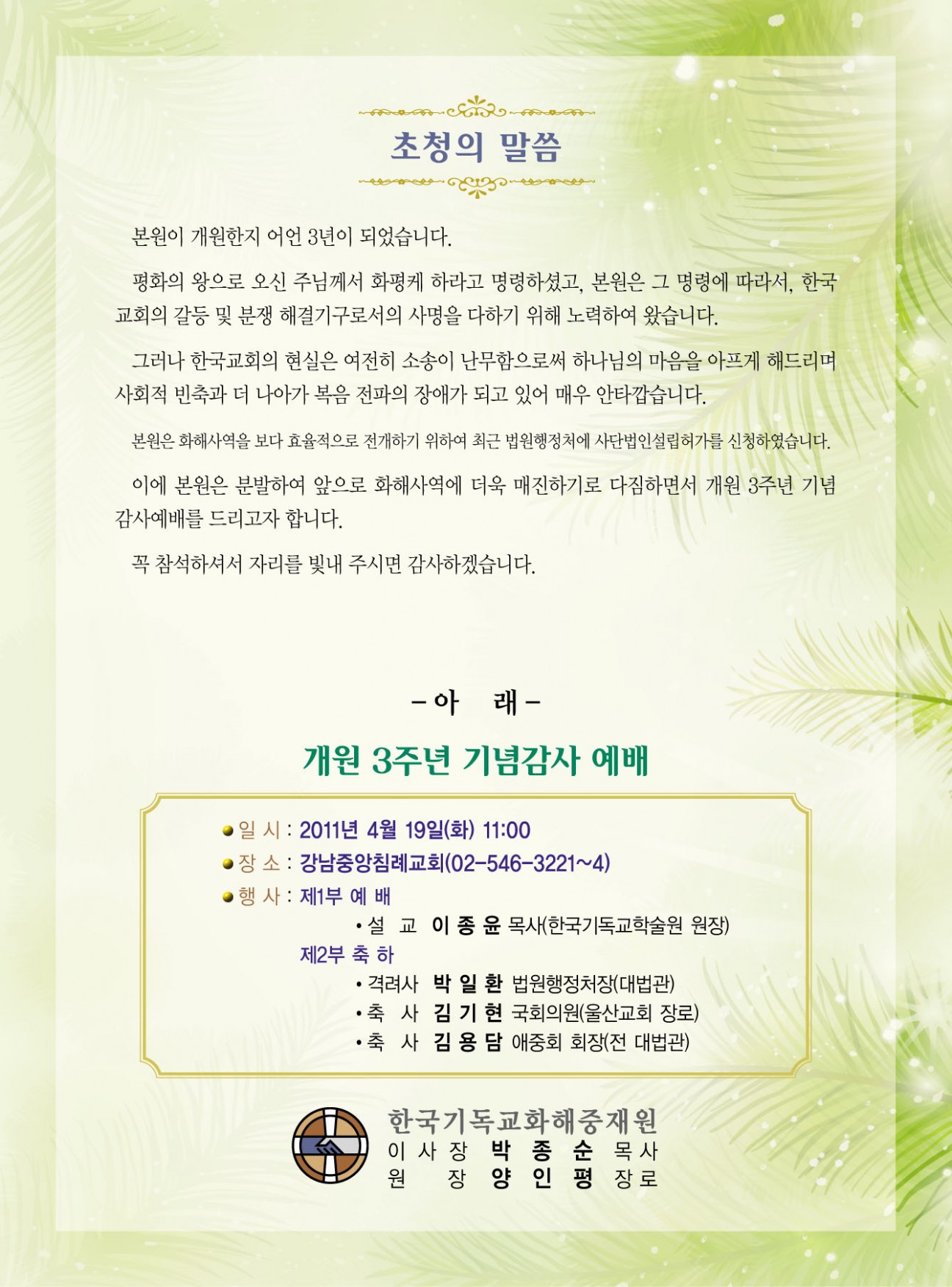 3주년 기념감사 예배 본문 3주년 기념감사 예배 많은 참석 바랍니다. 관리자 조회 2,325회 0201-04-05 00:00 수정 삭제 목록 댓글목록 이전글 제5차 정기 세미나 00.00.00 다음글 제4차 정기이사회 11.04.04
