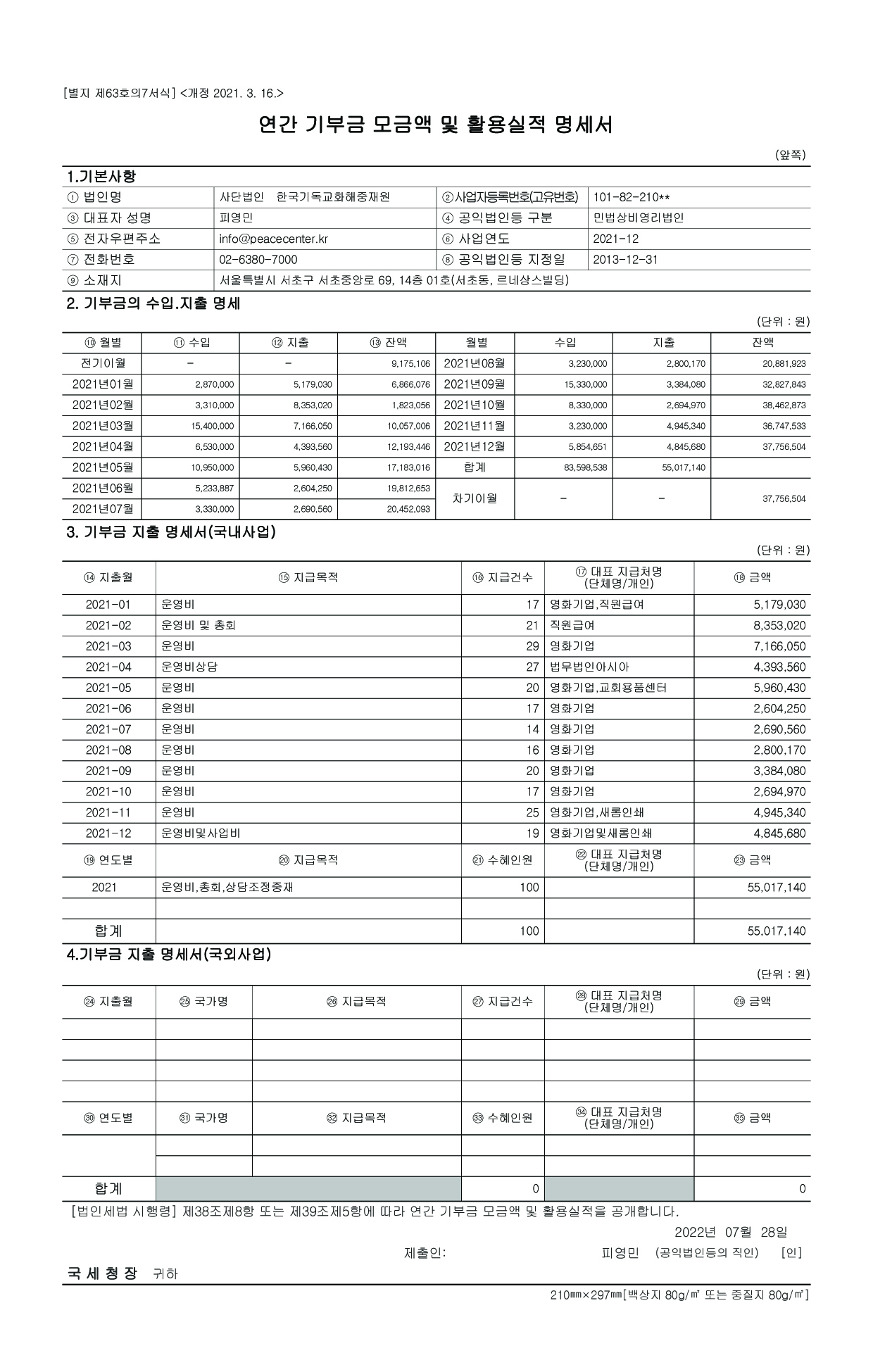 2021년 연간 기부금모금액 및 활용실적명세 본문 2021년 연간 기부금모금액 및 활용실적명세 2021년 연간 기부금모금액 및 활용실적명세 관리자 조회 1,171회 2022-07-28 00:00 수정 삭제 목록 댓글목록 이전글 2022년 공익법인 결산서류 등의 공시 23.08.10 다음글 2020년 연간 기부금모금액 및 활용실적명세 21.03.30