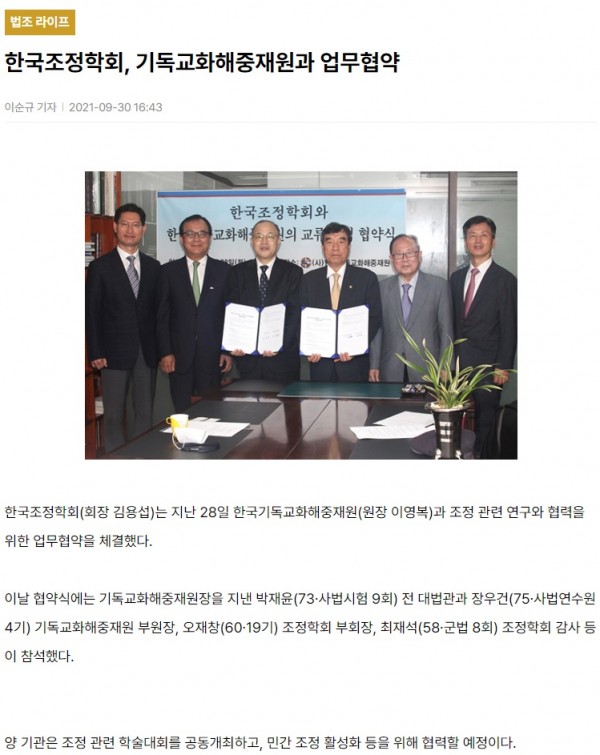 ▢ 주제 : 발제 부원장 장우건 변호사 제1주제 한국조정학회 회장 김용섭 교수(전북대학교 법학전문원) 제2주제 추일엽 목사(수원 주님의 교회 담임목사, 충남대학교 법학박사)▢ 일시 : 2021년 12월 16일(목요일) 오후 2:00–5:00 [강남중앙침례교회 유튜브 채널에서 실시간 시청 …