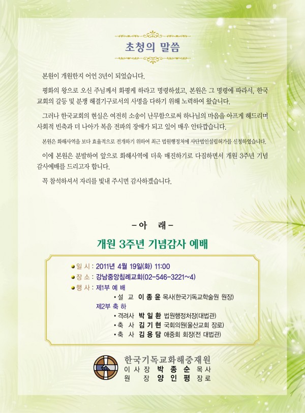 ▢ 일시 : 2011년 10월 25일(화) 16:00▢ 장소 : 한국기독교연합회관 17층 회의실 교회분쟁, 교회법정에서 해결되어야!-그리스도의 복음에 합당하게 생활하라(빌 1:27)- ● 기독교 영성과 교회 내 갈등발표자 : 이 철 목사(한국피스메이커 이사장, 본원 실행이사)● 교회갈등의 예방과 해결발표자 : 손경한 교수/변호사(성균관대 법학전문대학원) 많은 참석바랍니다.