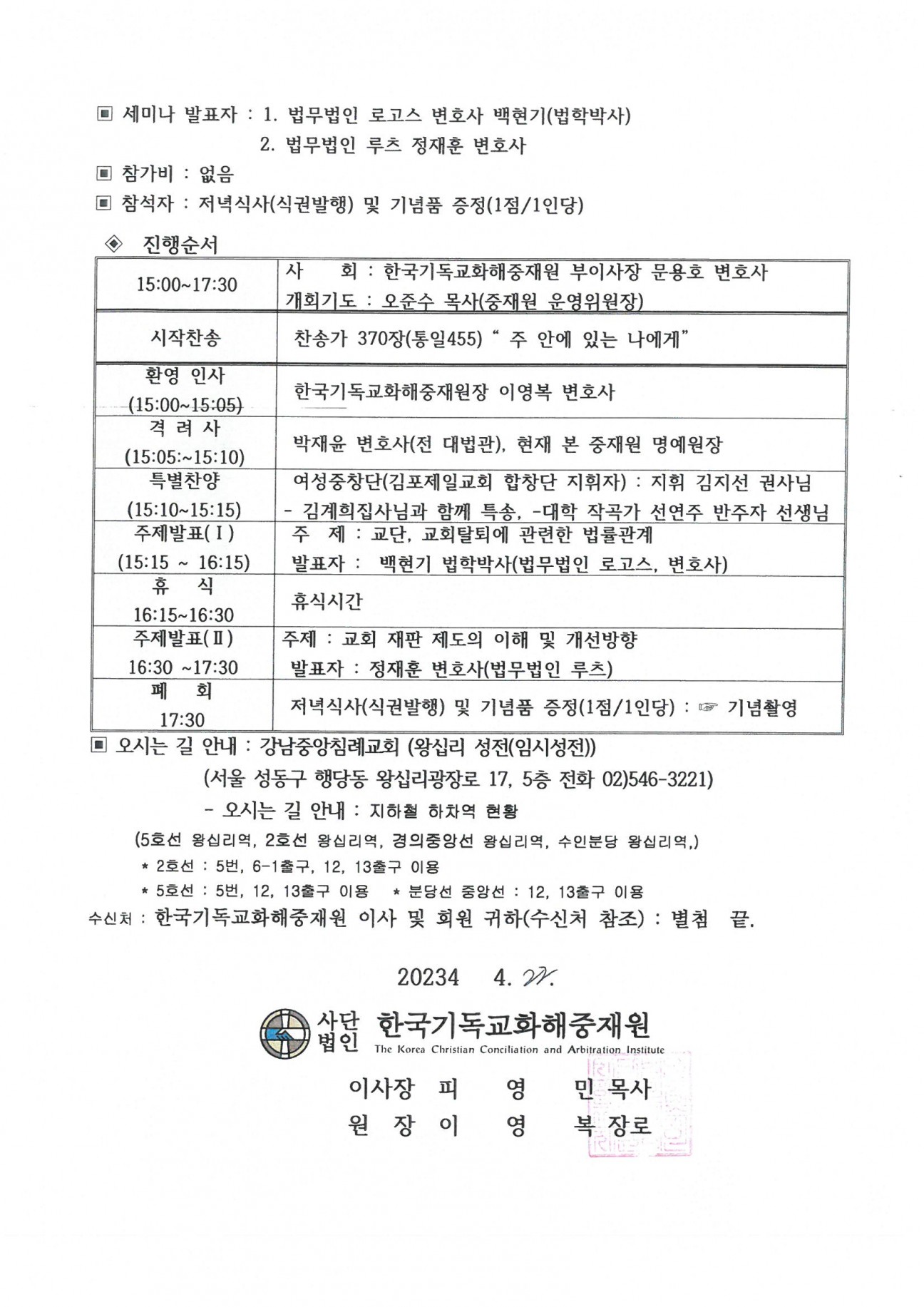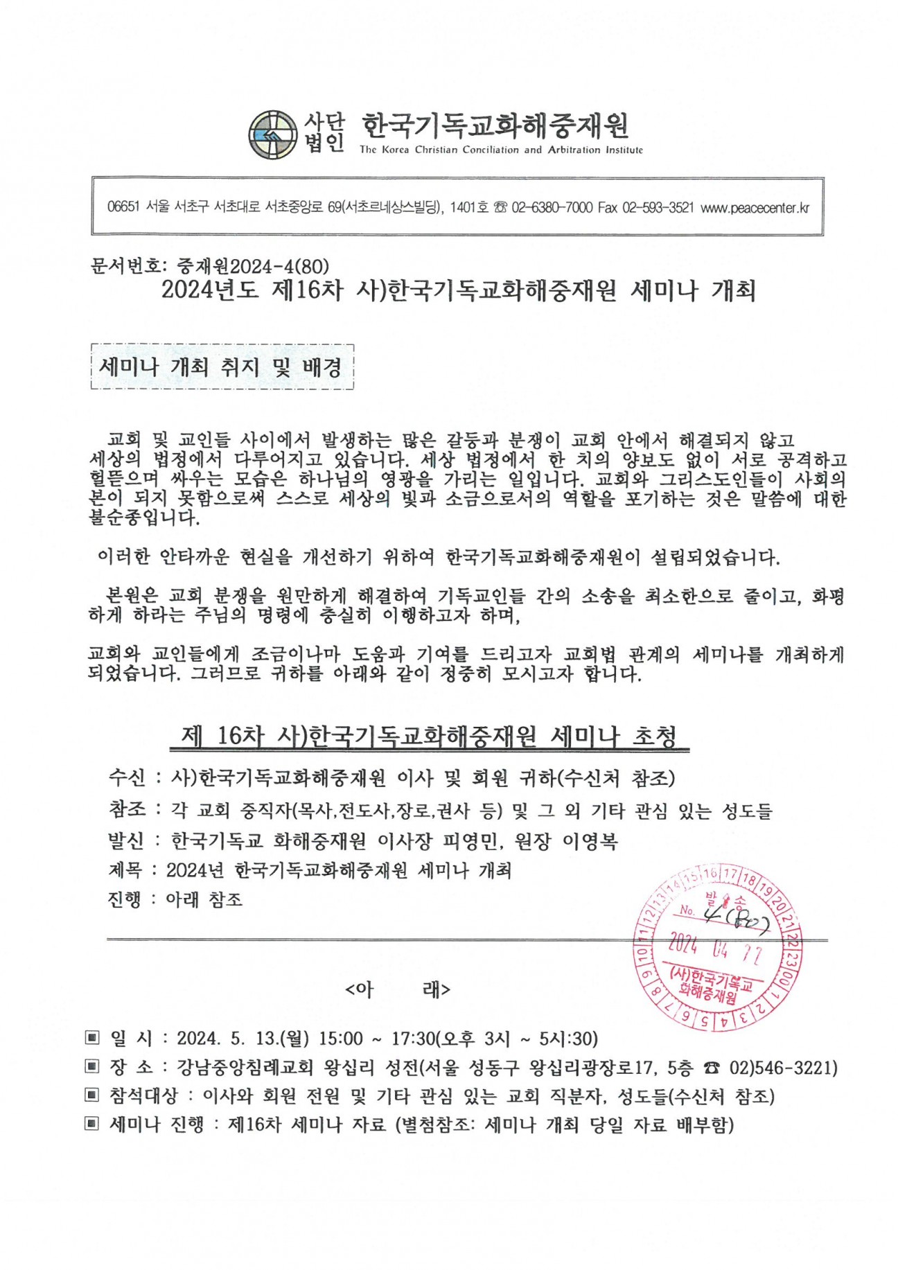 □2024년도 제16차 세미나 본문 □2024년도 제16차 세미나□2024년도 제16차 세미나 2024년도 제16차 한국기독교화해중재원 세미나○ 일시 및 장소 : 2024년 5월 13일 15:00~ 강남중앙침례교회○ 주체 : 사단법인 한국기독교화해중재원○ 협찬 : 기독법률가회○ 후원 : 강남중앙침례교회▶ 발표주제1. 교단탈퇴에 관련한 법률관계2. 교회 재판제도의 이해 및 개선방향 관리자 조회 1,509회 2024-05-07 13:26 목록 댓글목록 이전글 제137차 운영위원회 개최 24.06.11 다음글 □ 2024년 정기이사회 및 제14차 정기총회 24.01.15