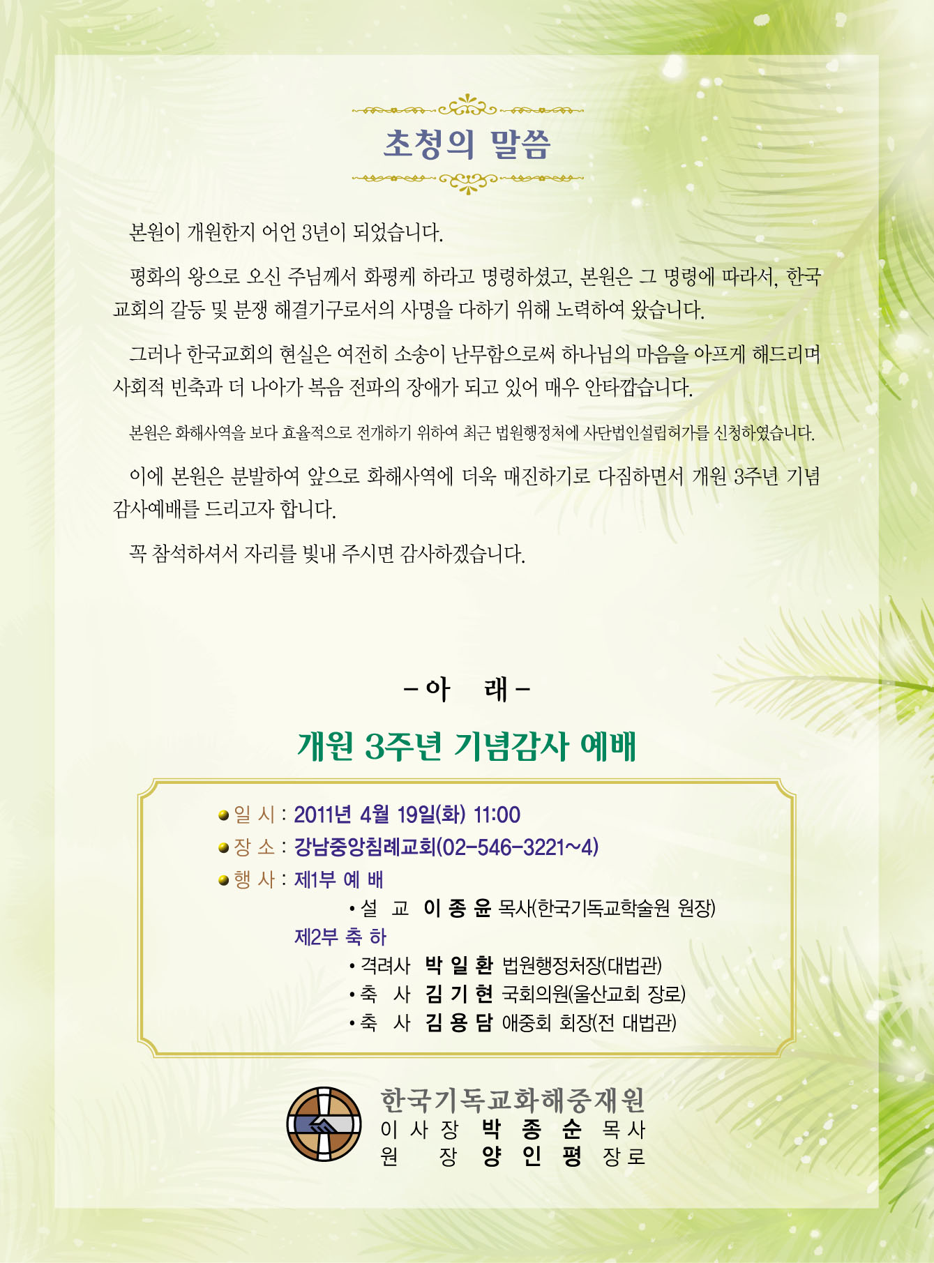 3주년 기념감사 예배 본문 3주년 기념감사 예배 많은 참석 바랍니다. 관리자 조회 2,332회 0201-04-05 00:00 수정 삭제 목록 댓글목록 이전글 제5차 정기 세미나 00.00.00 다음글 제4차 정기이사회 11.04.04