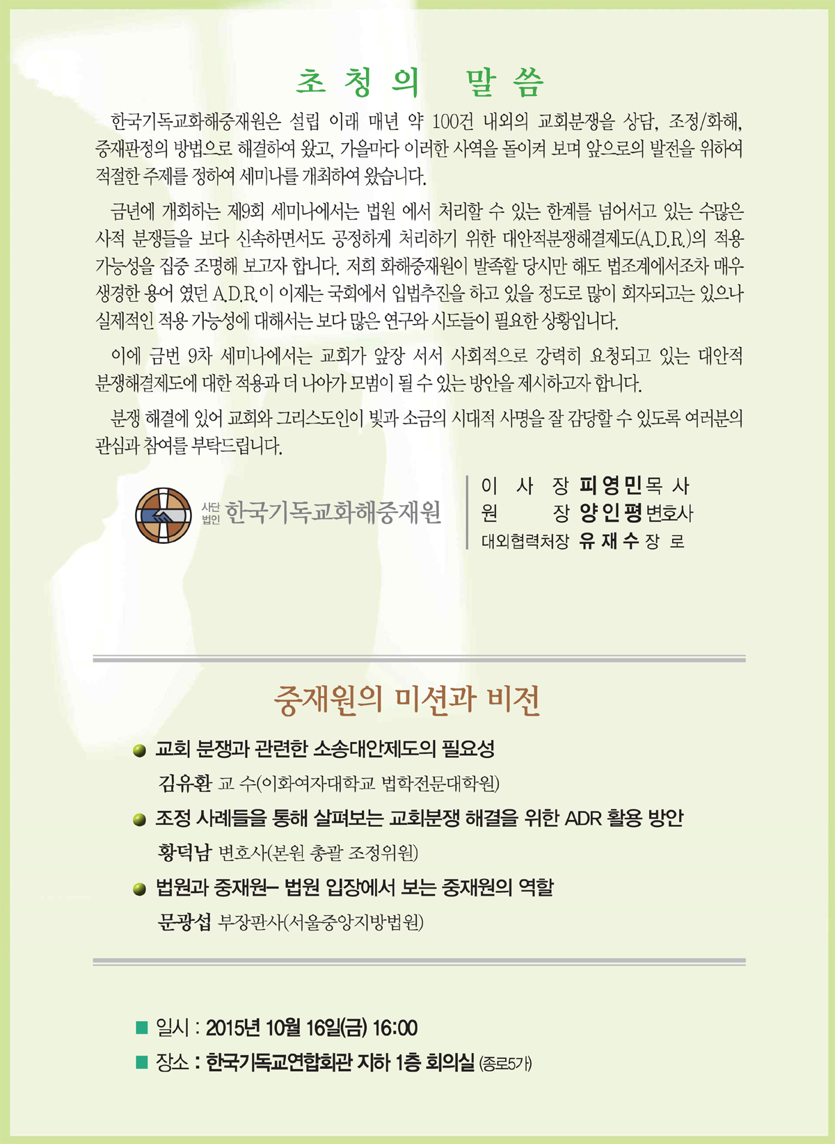 제9차 화해사역 세미나 본문 제9차 화해사역 세미나 일시 : 10월 16일(금) 16시장소 : 한국기독교연합회관 지하1층 회의실 이상입니다. 관리자 조회 2,002회 2015-09-30 00:00 수정 삭제 목록 댓글목록 이전글 제6차 정기총회 개최 안내 16.01.18 다음글 제2회 화해중재원 포럼 15.05.14